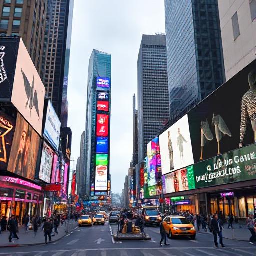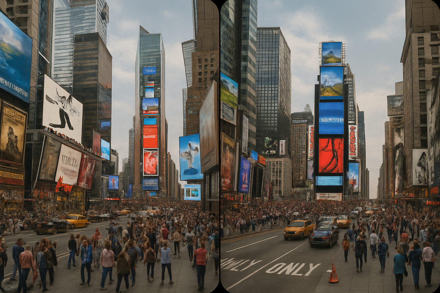 Prompt: Create a photo realistic stereo image of Times Square, refined with: The two images that form the stereo pair should be the same content but from slightly different viewpoints