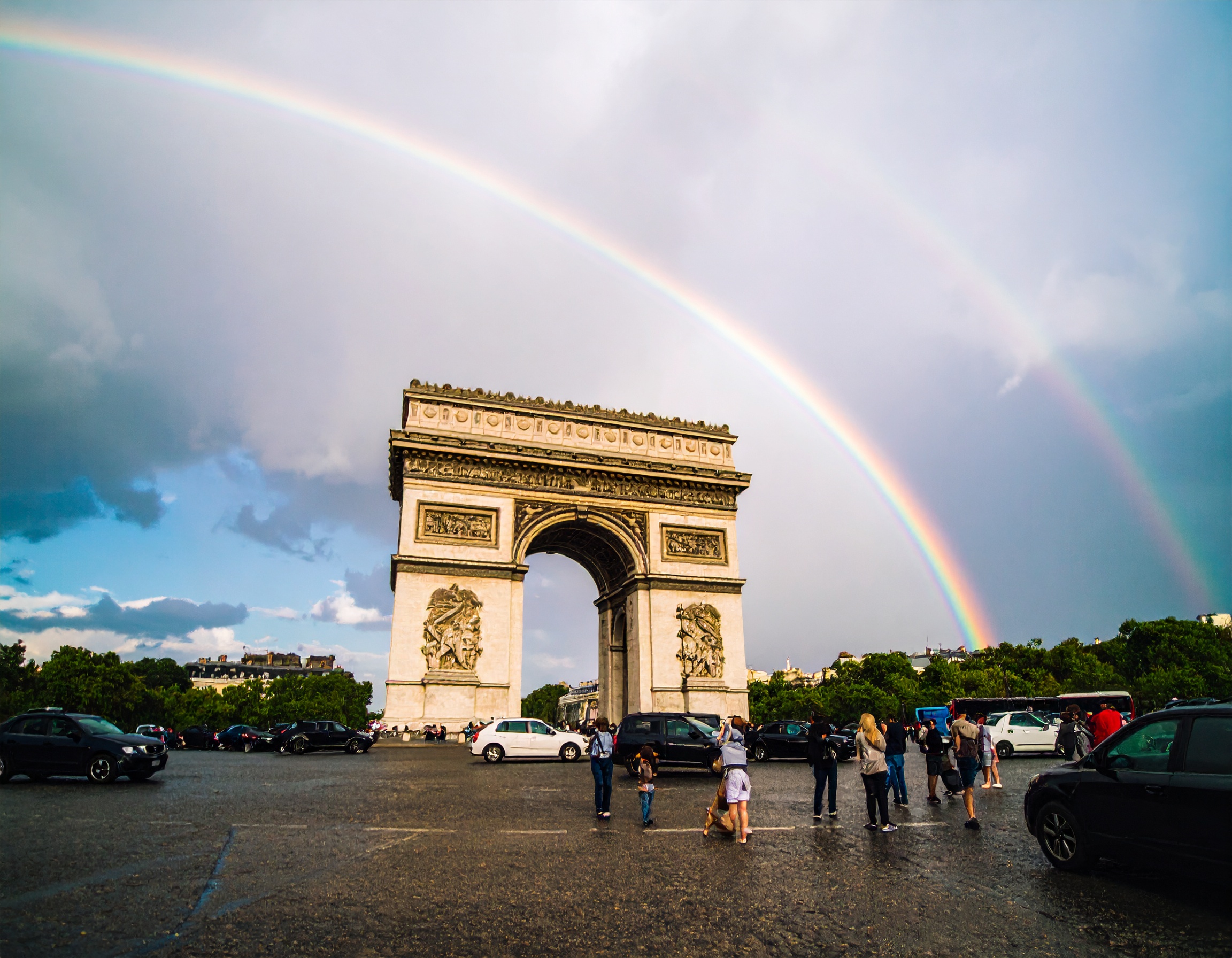Prompt: (Using the image to the left as the reference image) A photograph of the Arc de Triomphe in Paris. The viewpoint shows cars and people in front of the Arc. The weather is sunny but there is a rainbow in the sky. Some of the people are tourists taking photos of each other. Make sure the image shows the same scene as the reference image but from another viewpoint about 4 metres to the right.