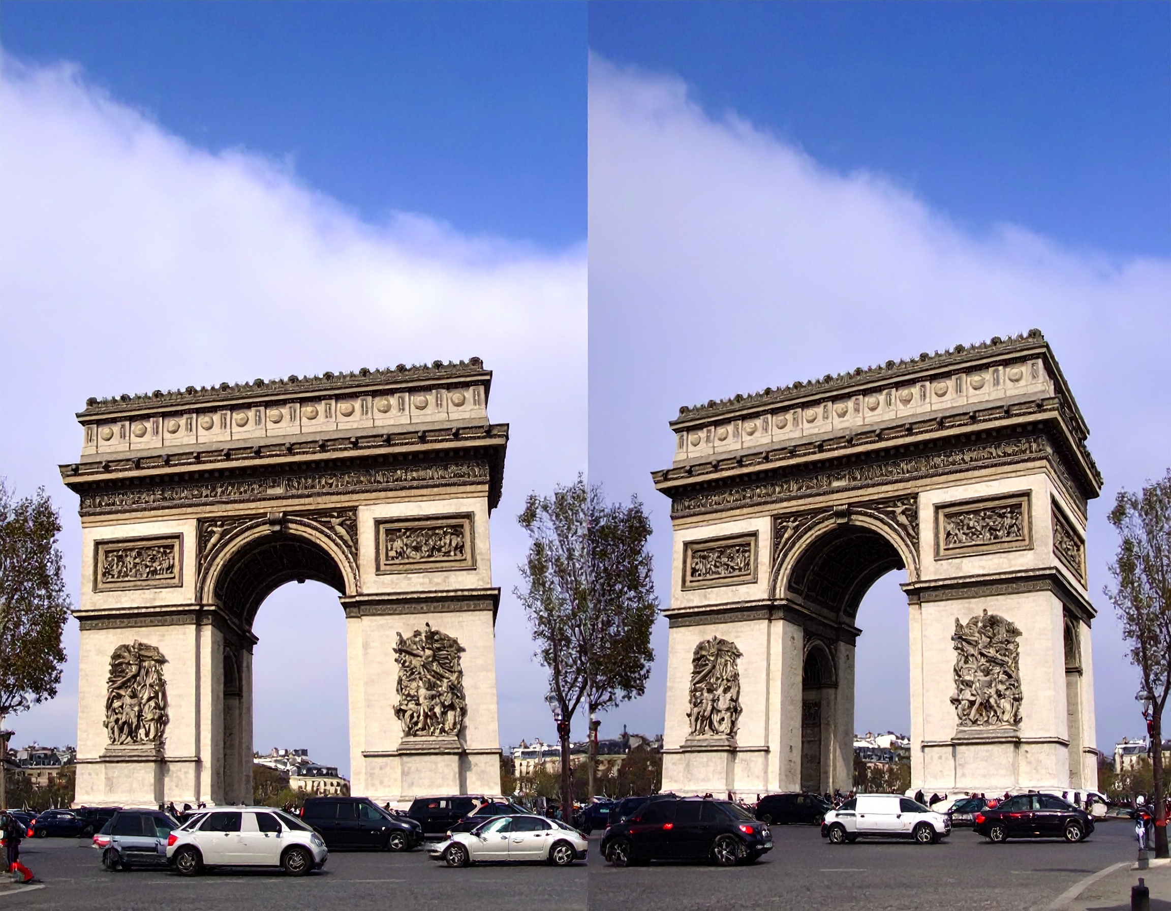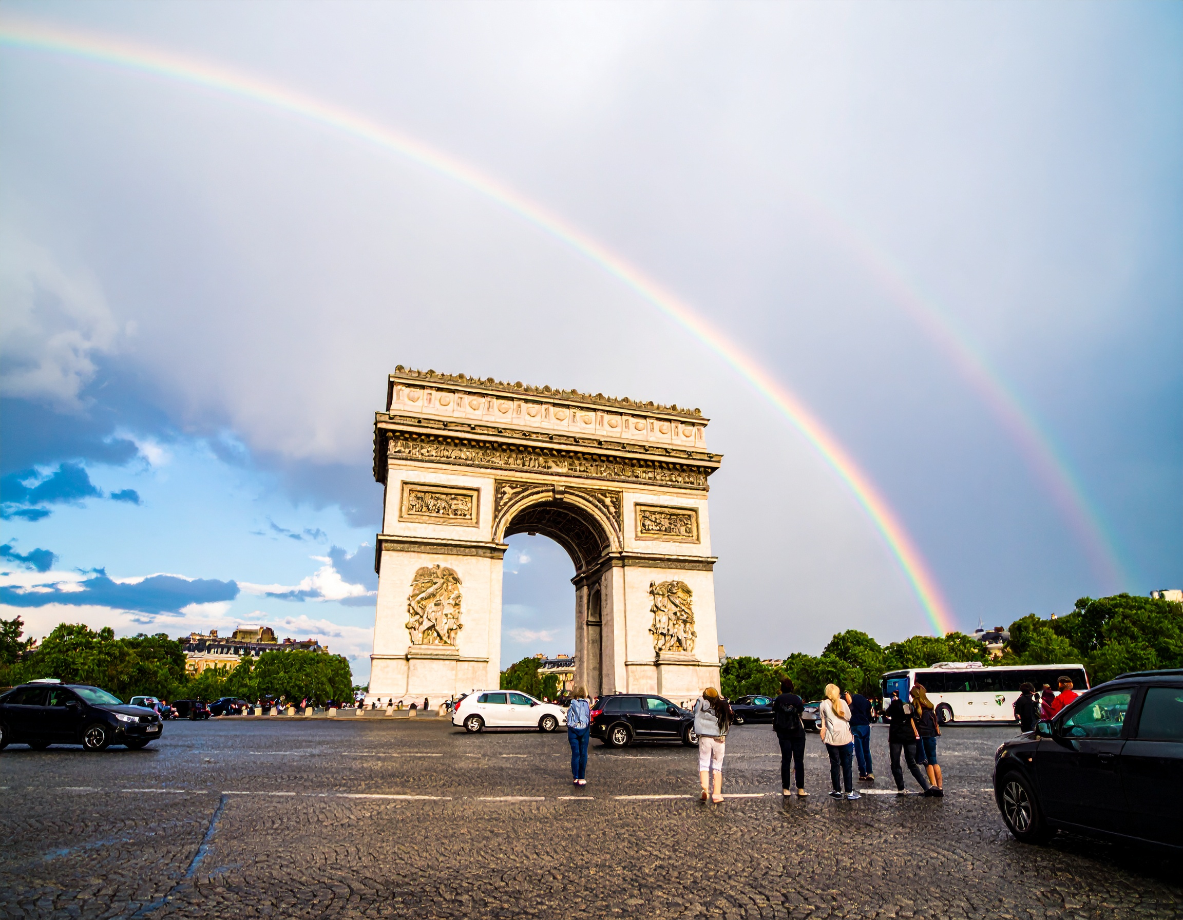 Prompt: A stereo photograph of the Arc de Triomphe in Paris; the baseline for the stereo camera is about 1 metre. The viewpoint shows cars and people in front of the Arc. The weather is sunny but there is a rainbow in the sky. Some of the people are tourists taking photos of each other.
