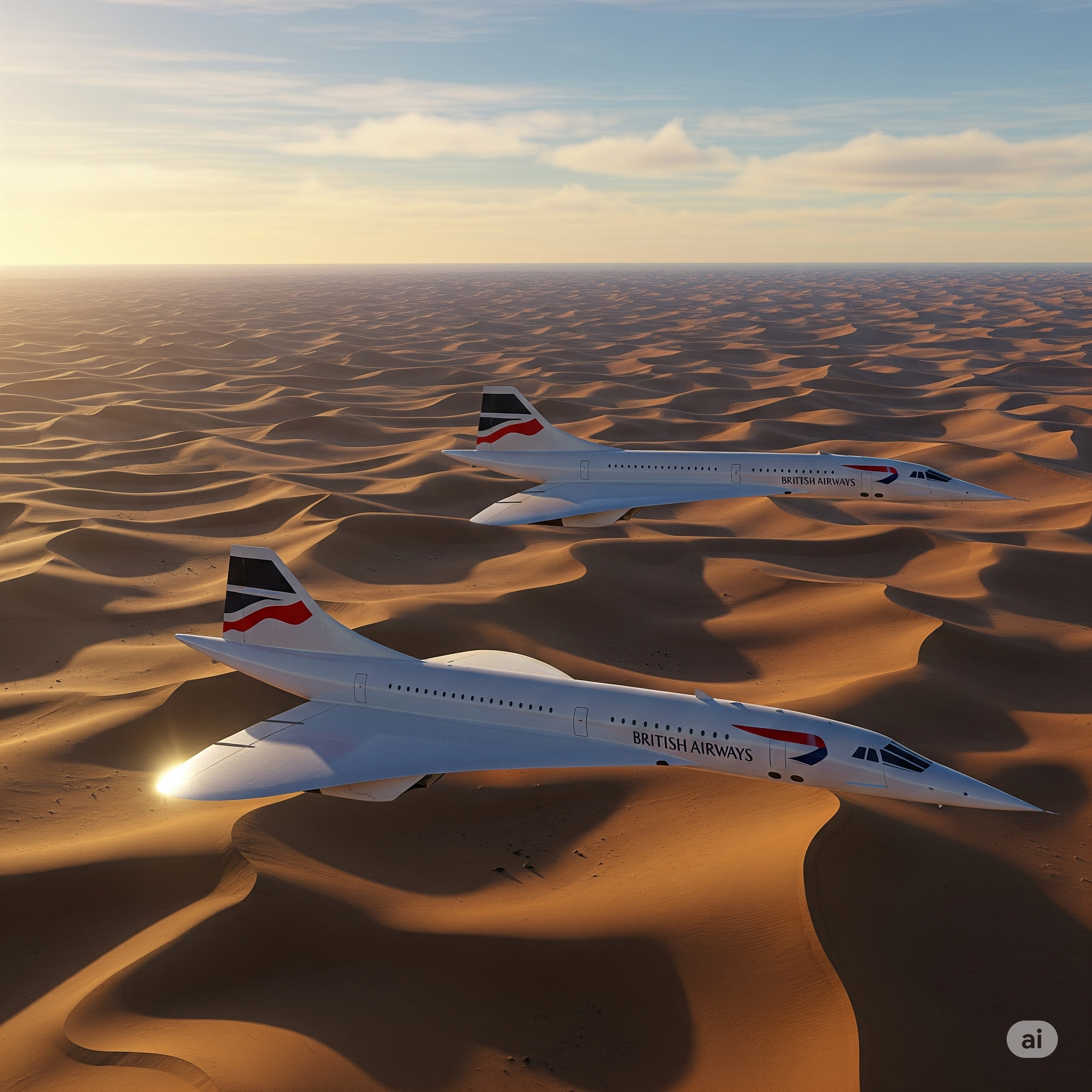 Prompt: Create a view of Concorde from above, flying over continuous rolling sand dunes. The sun reflects from the wing edges. The tail has the British Airways livery. refined by Create the same view but zoomed out so that we can see a second Concorde flying in the same direction; the previous image was taken from a window on the second Concorde.