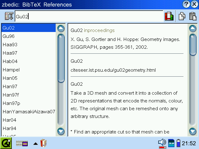 The script picks out the title, author, year etc and formats that in bedic style. It also picks out the URL and adds the notes (if they exist). You get quick and easy reference to your document database, notes, etc. The only drawback is that you can only search by citation key (bedic is a dictionary format so you can't expect everything).