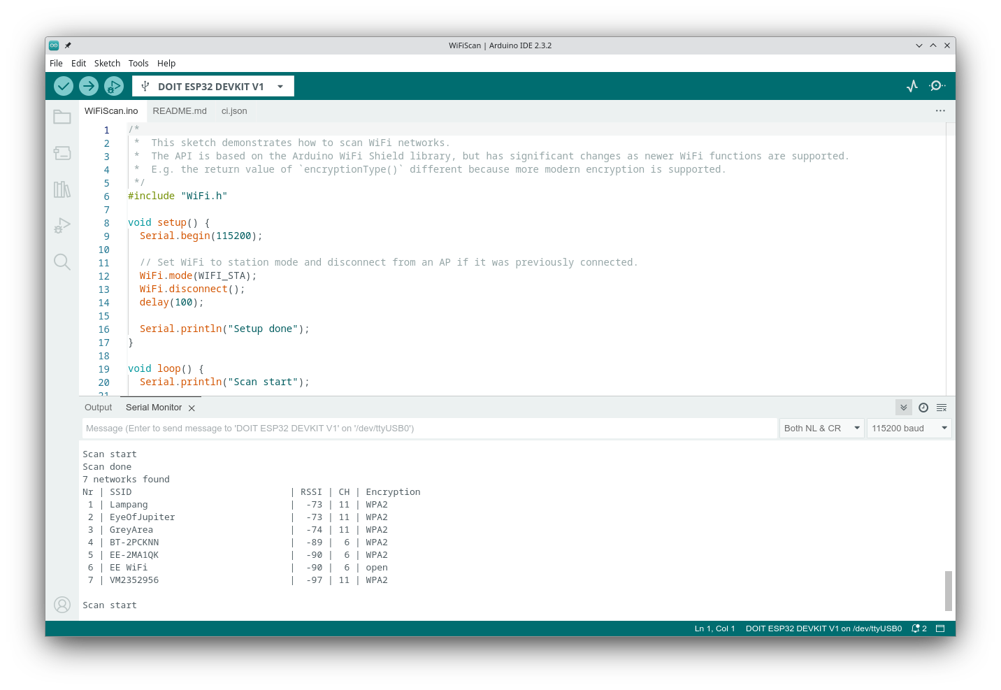 Open the serial monitor to check the output. Make sure to select the correct data rate or the text will be unreadable.