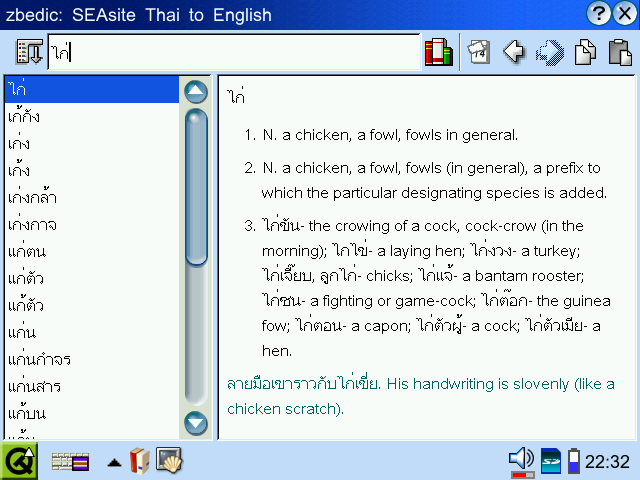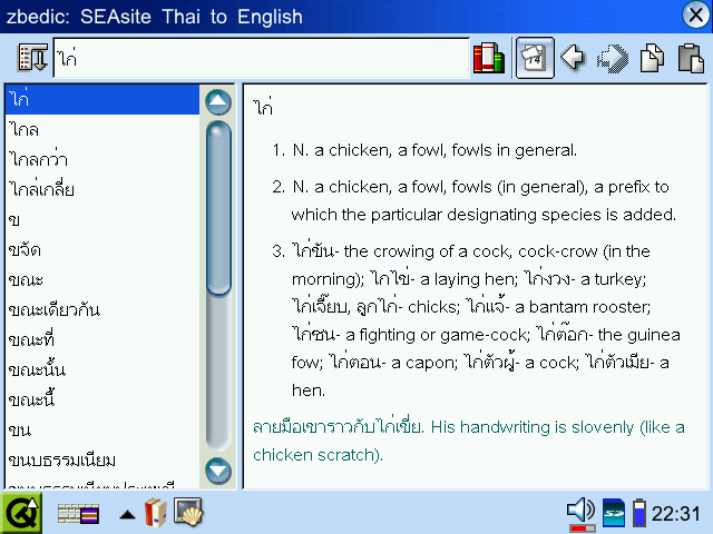 zbedic is a dictionary program for the Zaurus written by Latchesar Ionkov and Rafal Mantiuk; this version of ZBedic implements Thai dictionary sorting order.