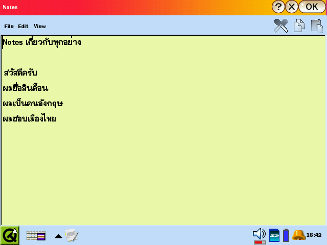 The Zaurus does not come with any Thai fonts installed. I have converted some Thai TrueType fonts (TTF) to Qtopia Prerendered Font (QPF) format. Please see my Thai Zaurus Fonts page.